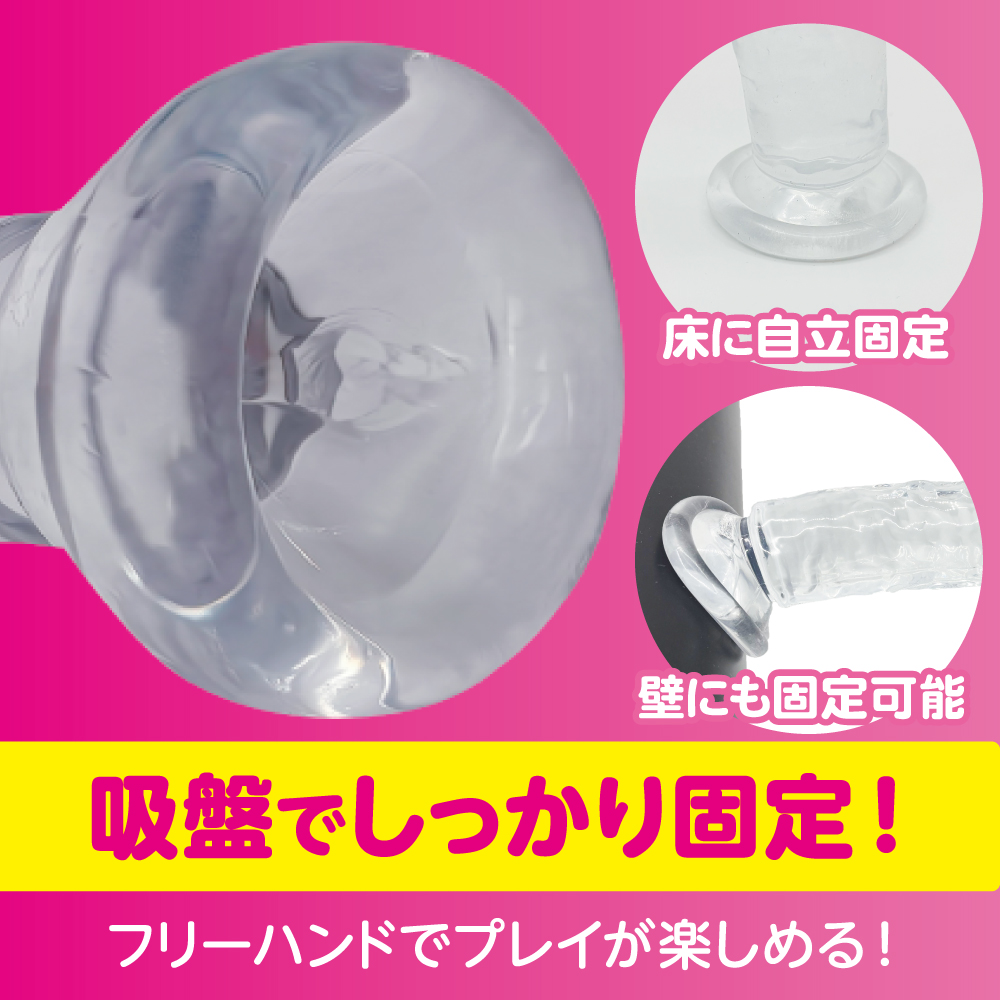 初心者でも安心して使えるSサイズクリアディルド。 吸盤で壁や床に固定すればフリーハンドで使用可能。 初めてでも安心の、スタンダード形状のクリアディルド。 挿入部130mm、最大幅28mmと、日本人男性の平均に合わせた使いやすいサイズ感。 根元の吸盤で床や壁に固定すれば、手を使わずに様々な体勢で楽しめます。 小ぶりなサイズでも適度に施されたデコボコがしっかり刺激を生み出します。 色・フォルムともに生々しさを抑えたディルドです。