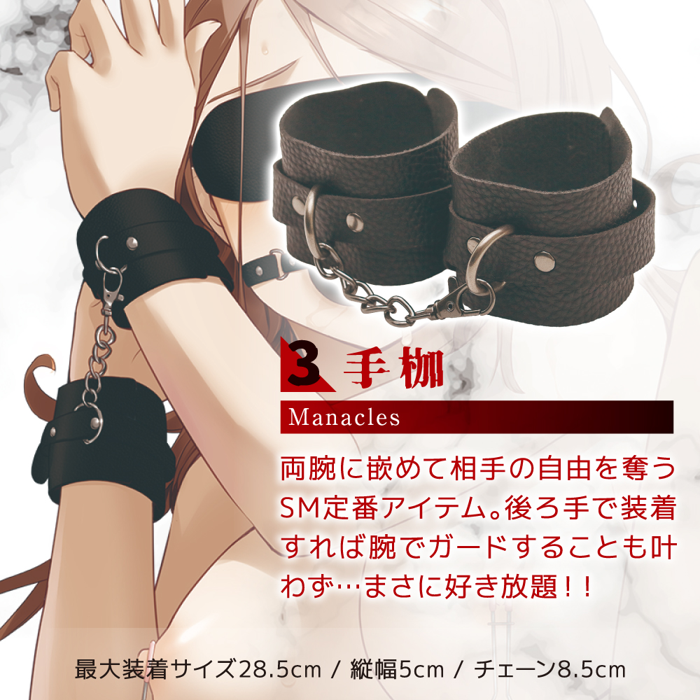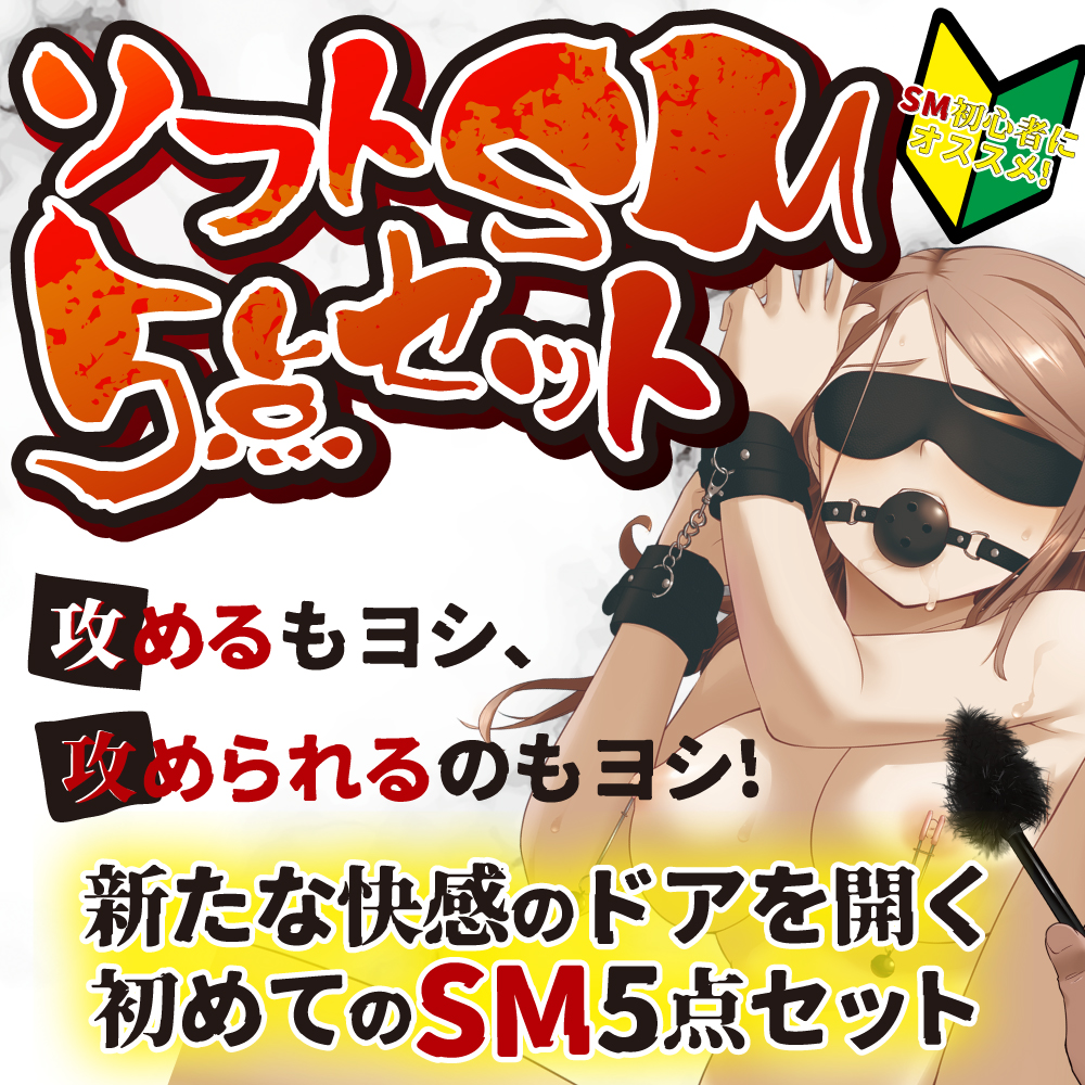 SM入門者向けの基本SM5点セット。ベルトや金具 部分は本格的な作りで雰囲気もバッチリ。 SM入門者向けのSM5点セット。 内容物は「アイマスク」「ボールギャグ」「手枷」「乳首クリップ」「羽ぼうき」。 入門向けといえども金具部分やベルト等はしっかりとした作りで、本格的なSM気分を楽しめます。 羽ぼうき等、痛みを伴わないプレイが可能なセット内容なので、普段のエッチにマンネリを感じてい るカップルにもおすすめできます。